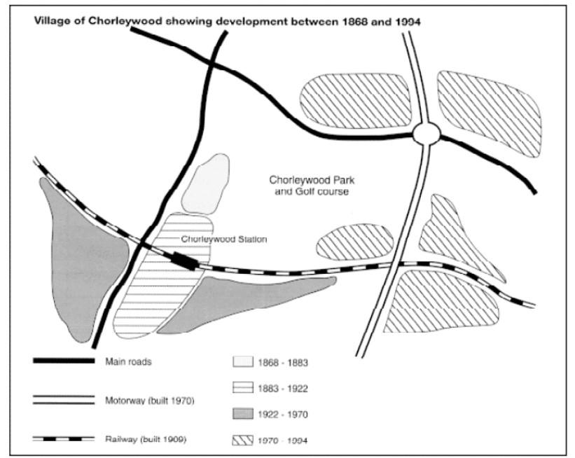 Initially, there was the main road from south-west to Northwest and second was North-west to North-east, Later motorway was built in 1970 from South-East to North-east which cross the main road, there was a railway track which was built in 1909 from South-west to South-east. Lastly, in-between all this track, there is a Chorleywood park and golf course.