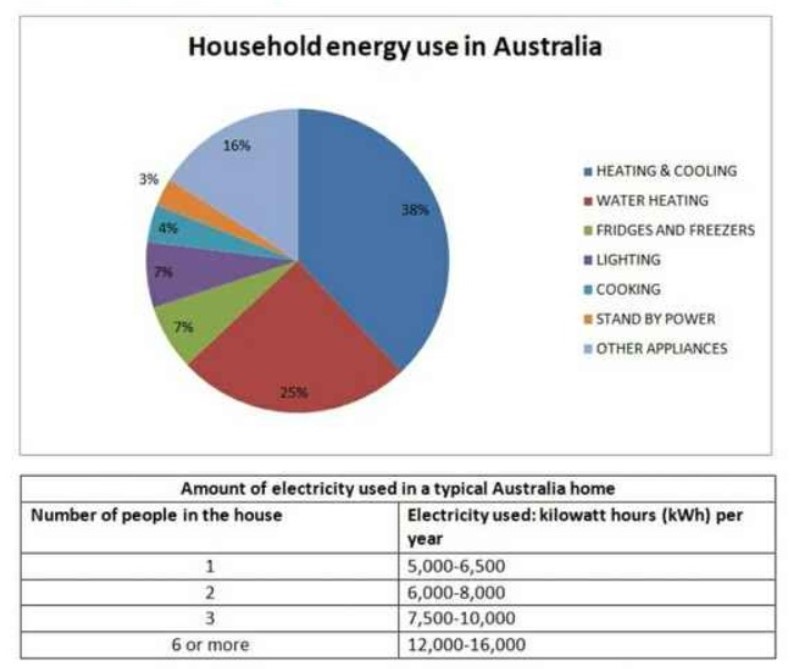 The pie chart below shows where energy is used in a typical Australian household, and the table shows the amount of electricity used according to the number of occupants. Summarize the information by selecting and reporting the main features, and make comparisons where relevant.