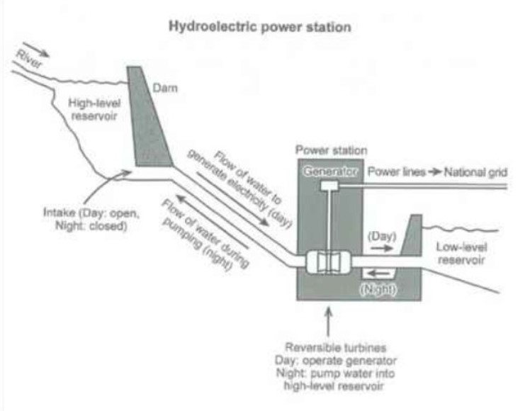 The diagram below shows how electricity is generated in a hydroelectric power station. Summarise the information by selecting and reporting the main features, and make comparisons where relevant.