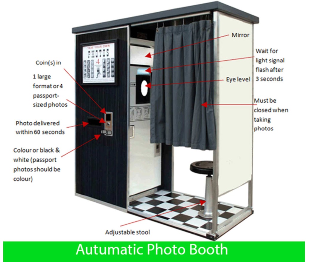 The Picture giving information about the automatic photo booth. Summarise the information by selecting and reporting the main features and make comparisons where relevant. Write at least 150 words.