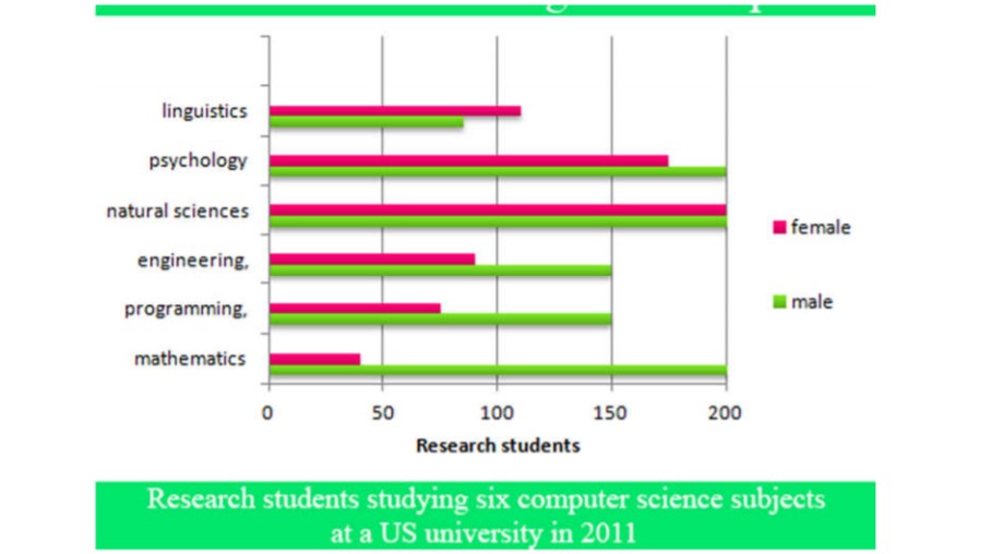 The bar graph below shows the numbers of male and female research students studying six computer science subjects at a US university in 2011. Summarise the information by selecting and report in the main features, and make comparisons where relevant.