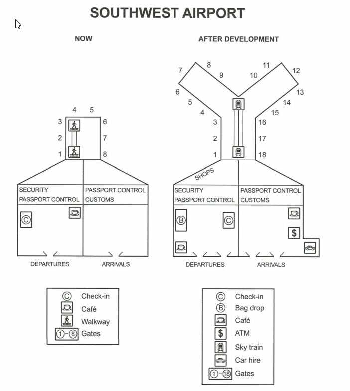 The plans below show the site of an airport now and how it will look after redevelopment next year. Summarise the information by selecting and reporting the main features, and make comparisons where relevant.