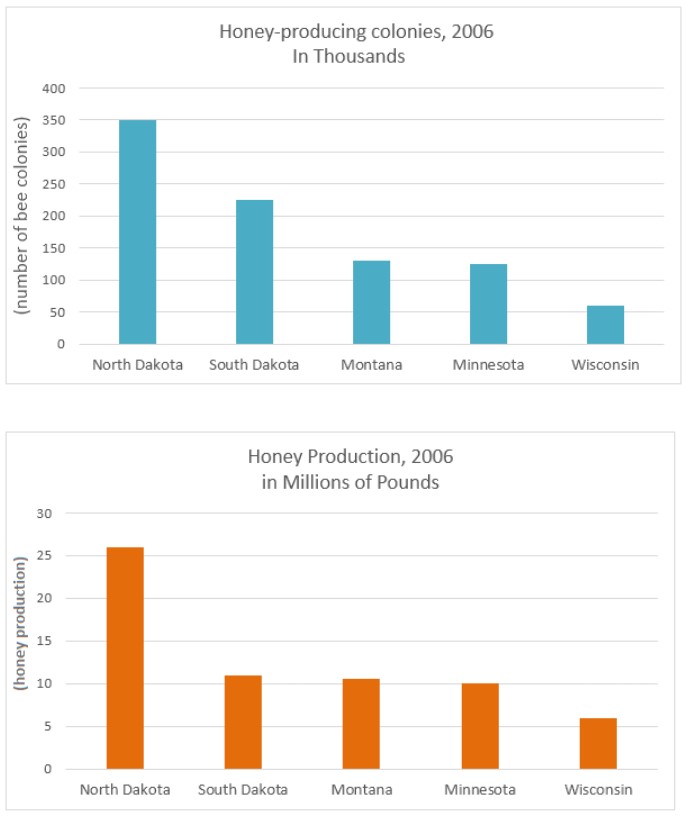 The bar charts illustrate the data of honey manufacturing and its producing colonies for five USA provinces (North and South Dakota; Montana; Minnesota & Wisconsin) for the year of 2006. It is readily apparent from the provided graphs that honey colonies are measured in thousands of numbers while production is given in millions of pounds.