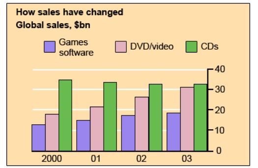 The chart below gives information about global sales of games software, CDs and DVD or video. Summarise the information by selecting and reporting the main features, and make comparisons where relevant.
