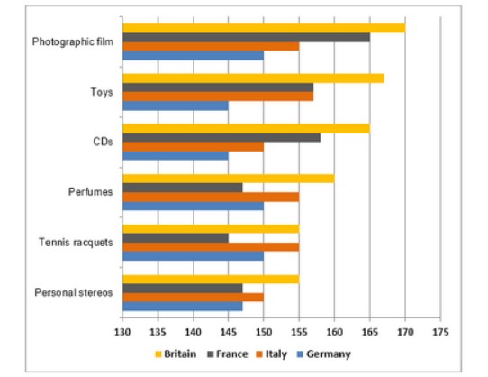 Getting back to the details, Britain spend 170 amount on photographic film, while 155 amount on tennis racquets and personal stereos. As for toys and CDs, Britain spends around 165 amount. However, 160 spent on perfumes. France utilizes 160 amount of photographic film, while 155 is spent by Italy. In contrast, Germany spent 150 on photographic film. with regards to toys and CDs, France and Italy accounted for around 155, whilst Germany spent less, which is 145.