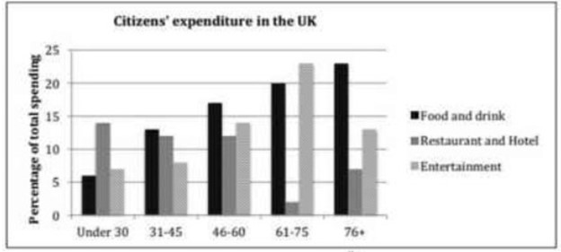 The chart below shows the expenditure on three categories among different age groups of residents in the UK in 2004. Summarise the information by selecting and reporting the main features, and make comparisons where relevant. Write at least 150 words.