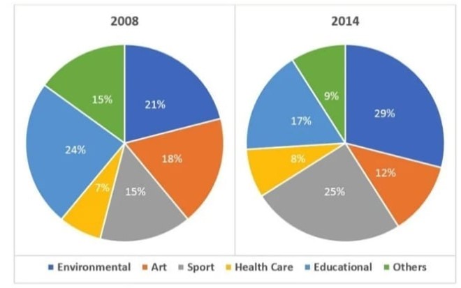 After one year and half a decade later, work for Health care proportion was nearly same as in 2008. people who did voluntary work percentage decline 6% in arts and other organizations A quarter proportion of volunteers joined with sports field whereas, environment and education had 29% and 17% respectively.