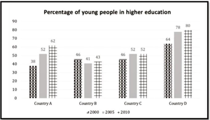 The chart below shows the percentage of young people in higher education in four different countries in 2000, 2005 and 2010. summarise the information by selecting and reporting the main features and make comparisons where relevant.