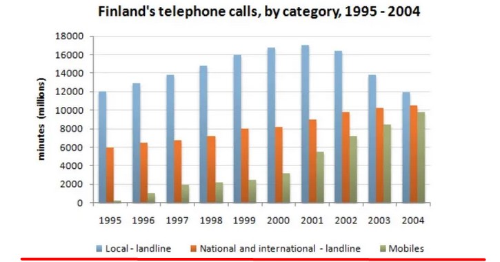The chart below shows the total number of minutes (in millions) of telephone calls in Finland, divided into three categories, from 1995 – 2004. Summarise the information by selecting and reporting the main features, and make comparisons where relevant.