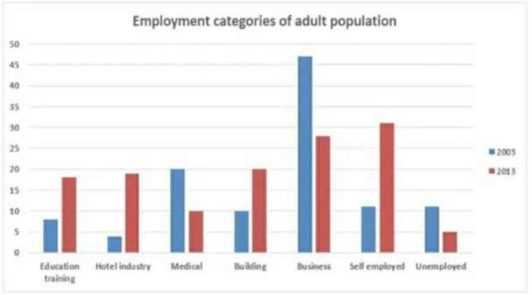 Business Industry is leading among all other categories with an employment rate of around 45 in the year 2003 and then sudden decrease to approximately 27 in 2013, while self-employed category shows an increase of around 20 adult population over a period of 10 years.