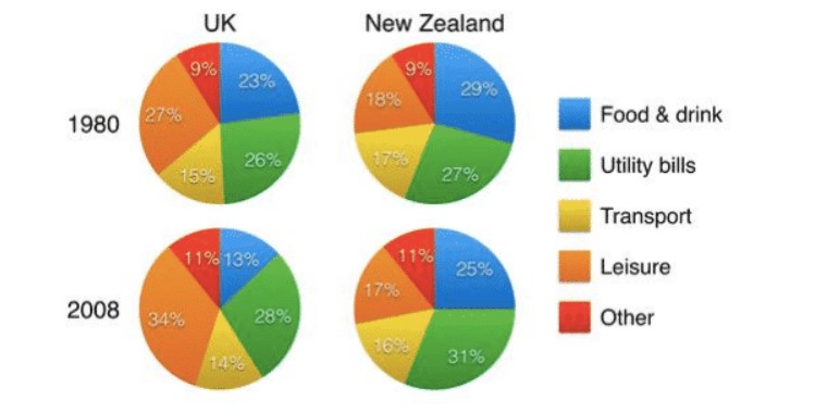 Pie charts illustrate the data of household expenses pattern for the country the UK and New Zealand for the year 1980 to 2008.