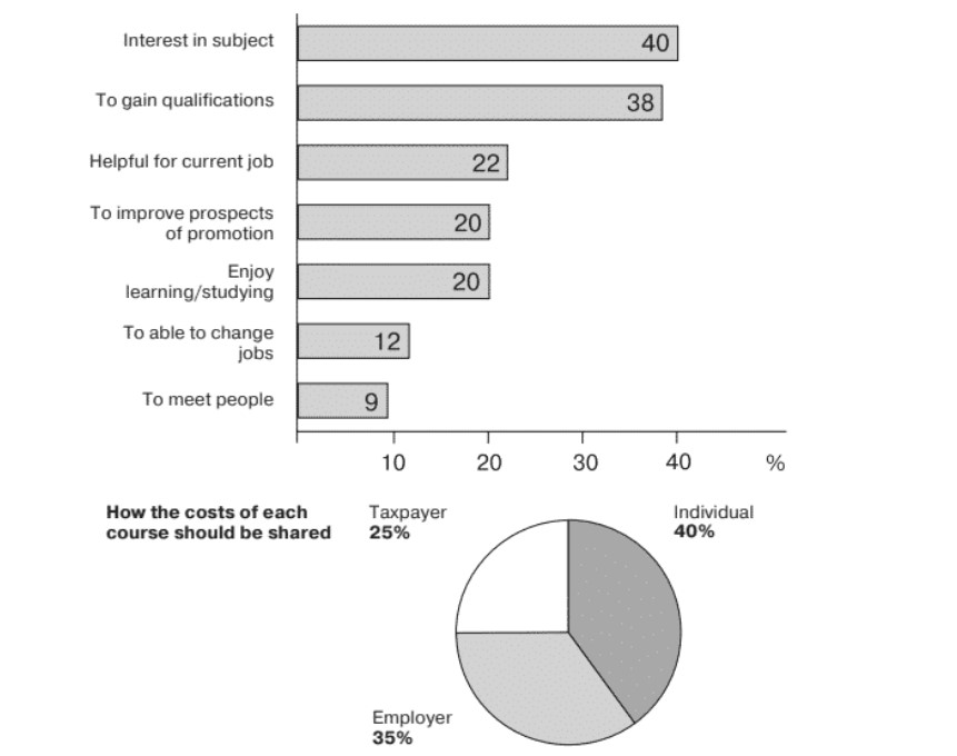 The charts below show the results of a survey of adult education. The first chart shows the reasons why adults decide to study. The pie chart shows how people think the costs of adult education should be shared. Write a report for a university lecturer, describing the information shown below.