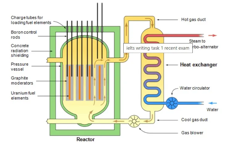 The diagram below shows the production of steam using a gas-cooled nuclear reactor. Summarise the information by selecting and reporting the main features, and make comparisons where relevant.