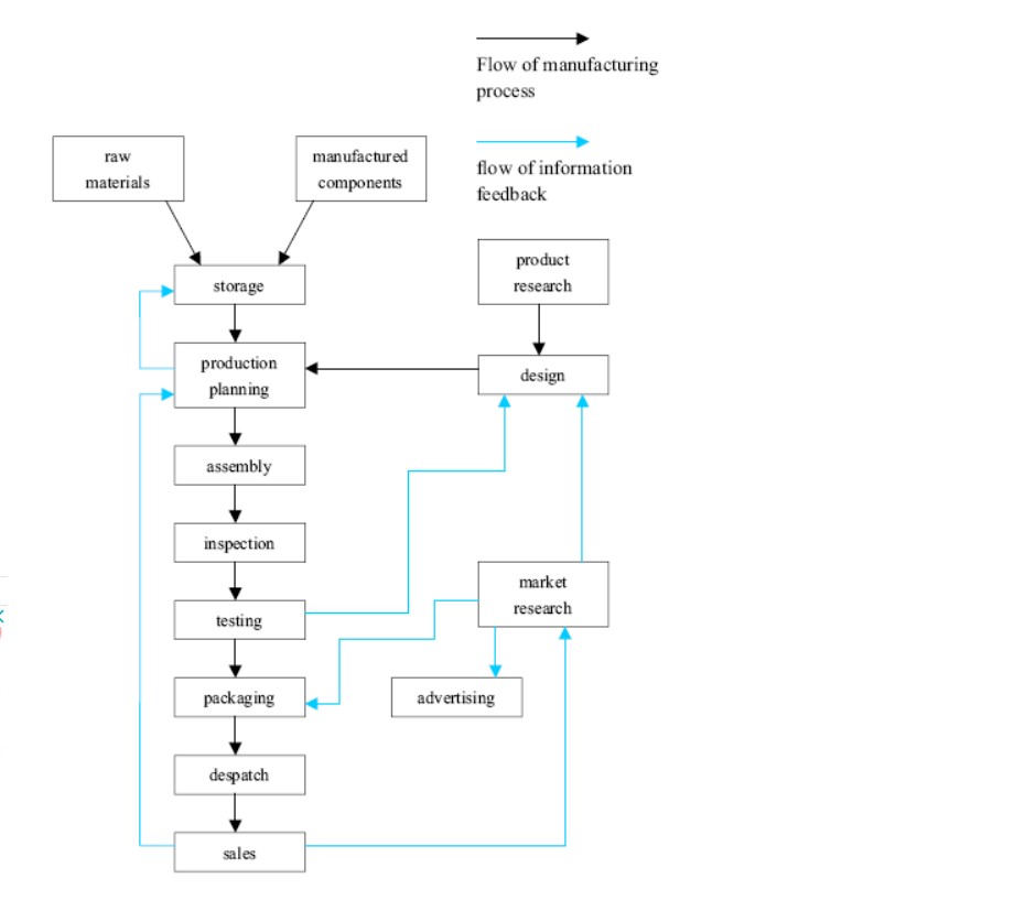 The diagram below shows the typical stages of consumer goods manufacturing, including the process by which information is fed back to earlier stages to enable adjustment. Write a report for a university lecturer describing the process shown.