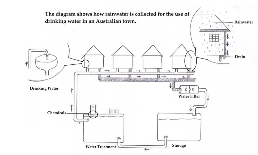 The Diagram shows how rainwater is collected for the use of drinking water in an Australian town. Summarise the information by selecting and reporting the main features, and make comparisons where relevant.