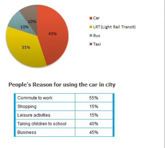 The first picture explains the information on how people commute to different places by car, Light Rail Transit(LRT), Bus and taxi. The second diagram also gives information on reasons people commute in a car to work, shopping, leisure activities, taking children to school and for their businesses.