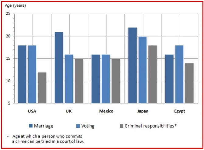 Secondly, the age for committing a crime and taking responsibility also differs in all the countries. USA survey shows that at the age 12 responsibility should be given, whereas, Japan thinks at the age 18. In addition, UK and Mexico believe at age 15, and they should be aware of their rights. Also, Egypt thinks at age 14 they should be responsible.
