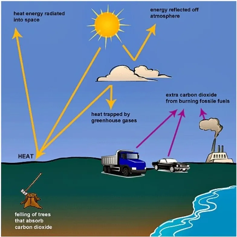 The picture illustrates the process of harmful gases entrapment in the atmosphere and solar energy distribution.
