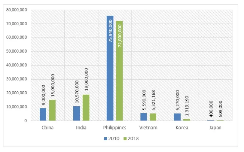 In 2013, the migration population was increasing in all the nations except Japan and Korea, where the population is decreasing. Highest population in the Philippines with 72,000,000. And, in China, India and Vietnam with ( 15,000,000 , 19,000,000 and 5,321,168 ) respectively. However, in Korea and Japan, the population seen 1,319,190 and 509,000, respectively.