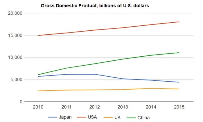 The graph illustrates the gross domestic product(GDP) of specified countries (USA, China, Japan and the UK)from three different continents, in a 5-year period between 2010 to 2015.
