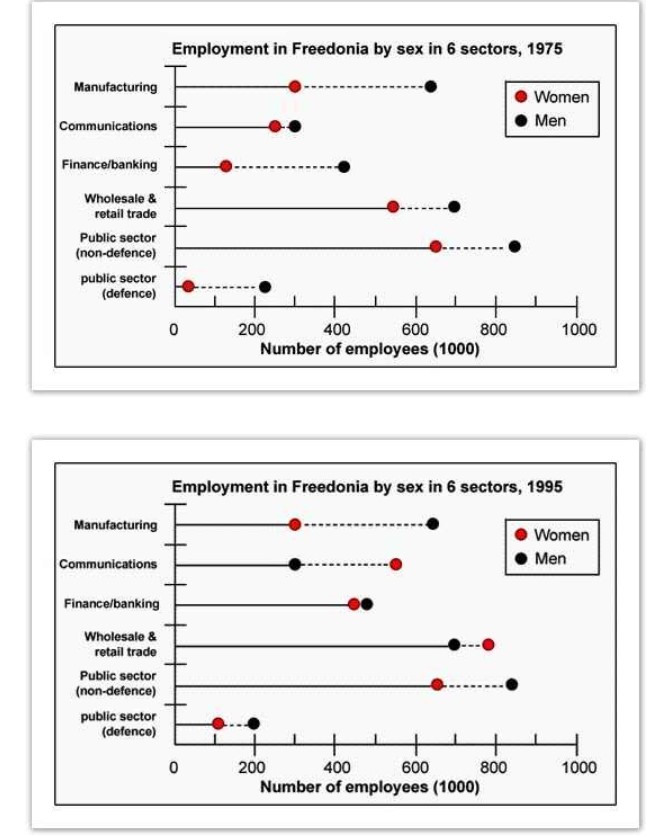 The graphs below show the numbers of male and female workers in 1975 and 1995 in several employment sectors of the Republic of Freedonia. Write a report for a university teacher describing the information shown.