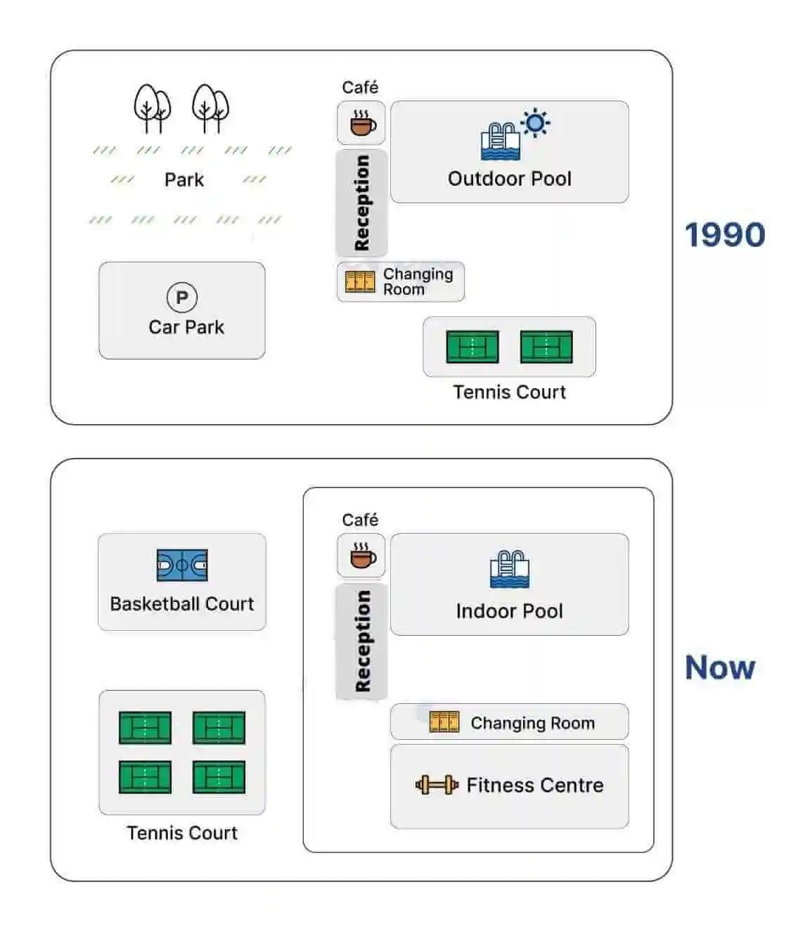 The two diagrams illustrate the information about the changing university sports court from 1990 to the present day.