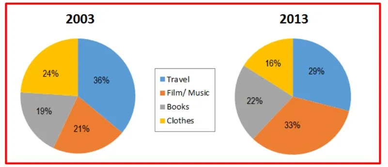 The given pie charts compare the online sales in percentages for travel, film/music, books and clothes in Australia during 2003 and 2013.