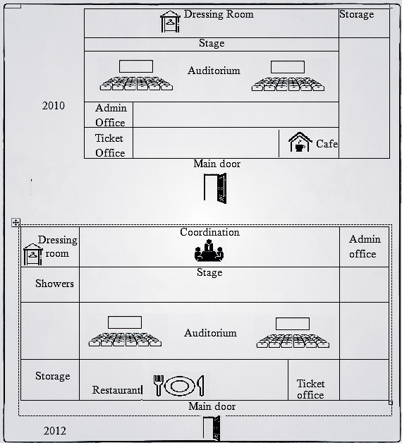 The plans below show a theatre in 2010 and 2012. Summarise the information by selecting and reporting the main features and making comparisons where relevant.