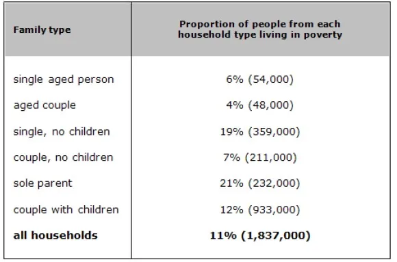 The table below shows the proportion of different categories of families living in poverty in Australia in 1999. Summarise the information by selecting and reporting the main features, and make comparisons where relevant.