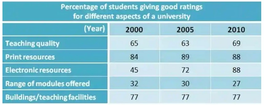The table below shows the results of surveys in 2000, 2005 and 2010 about one university. Summarise the information by selecting and reporting the main features, and make comparisons where relevant.