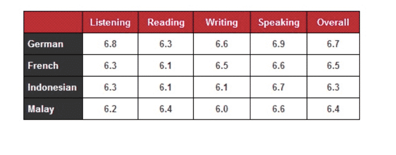 Moreover, the same score was attained by the native of France, Indonesia, and Malay in listening which was approximately 6.3, and the same trend was followed by nations who attained good scores in reading except for Malay (6.4). The plebeians from France, Indonesia, and Malay got 6.5, 6.1, 6.0 bands in writing respectively. The same bands were acquired by the folk of France and Malay which was 6.6 in