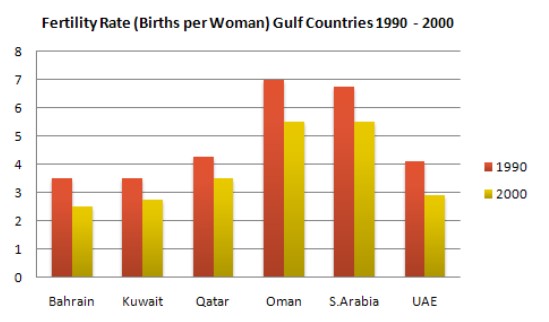 By 2000, the rate had fallen below three births per woman in Kuwait, Bahrain and the UAE, with a drop of over 25% in a decade in the UAE. However, in Saudi Arabia and Oman, the rates fell by just 20%, from 7.0 to 5.5.
